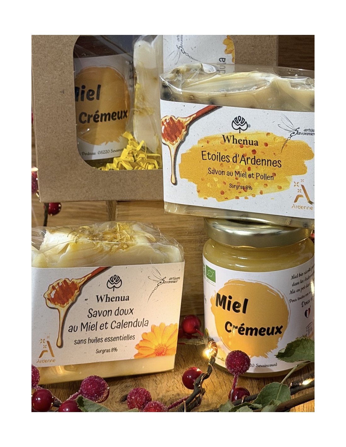 Notre coffret cadeau comprend un pot de miel bio local et un savon artisanal au choix :